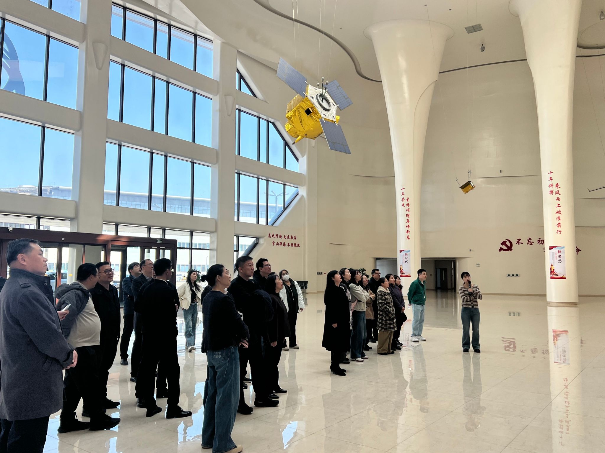 在基地专业讲解员的细致引导下,全体人员循着长光卫星技术股份有限公司发展足迹、“吉林一号”卫星系列重大研发成果、以及航天技术在民生保障、产业升级、科研创新等各领域的应用拓展。大家驻足科普长廊,透过观景窗近距离观摩卫星生产车间一线科研人员的工作场景,从航天技术的迭代升级到科研工作者的坚守奉献,从卫星遥感影像的实际应用到航天精神的传承弘扬,都让在场教职工深受震撼、倍感振奋,对航天工作者攻坚克难、勇攀高峰、精益求精、无私奉献的崇高精神心生敬佩。